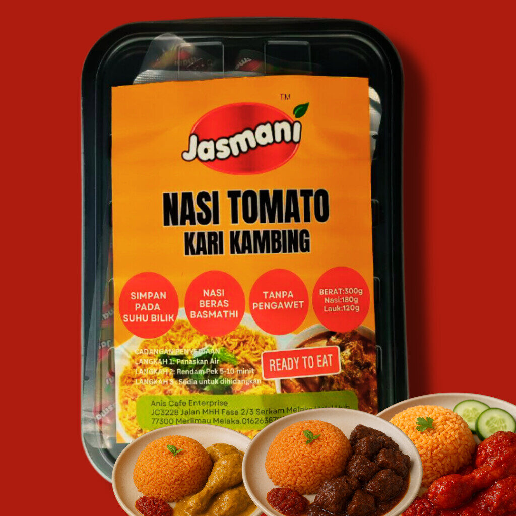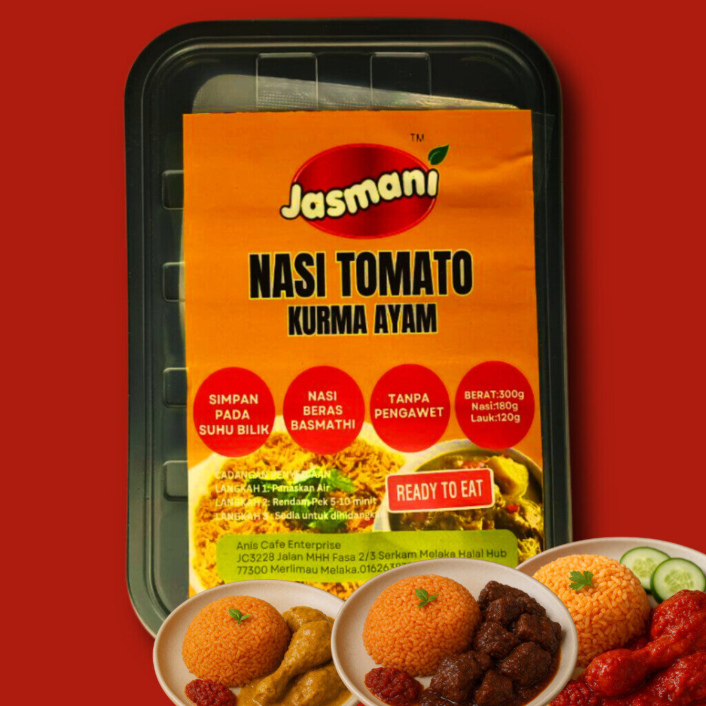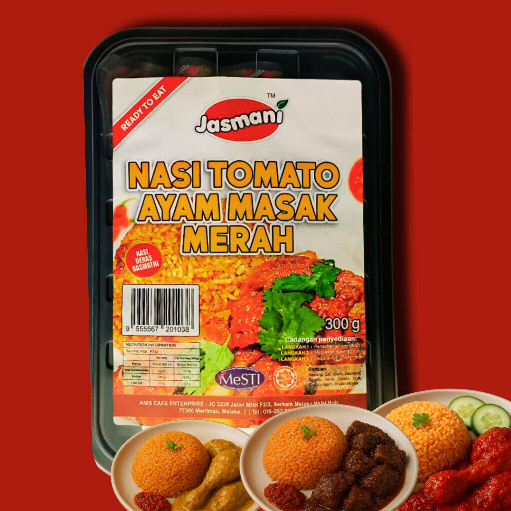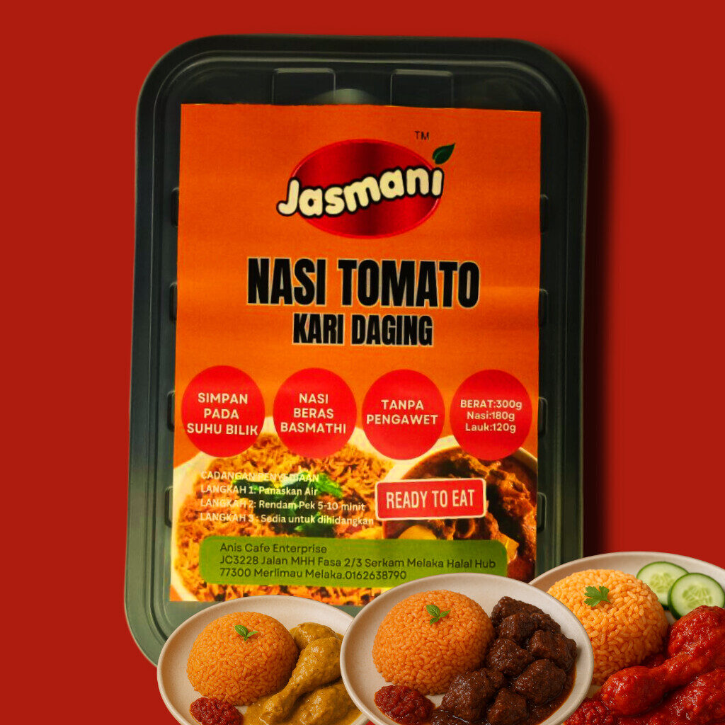 Nasi tomato yang harum, lembut & penuh rasa — dipadankan dengan pilihan lauk premium. Lengkap dengan pemanas, sesuai untuk travel, kerja, asrama & emergency meal.