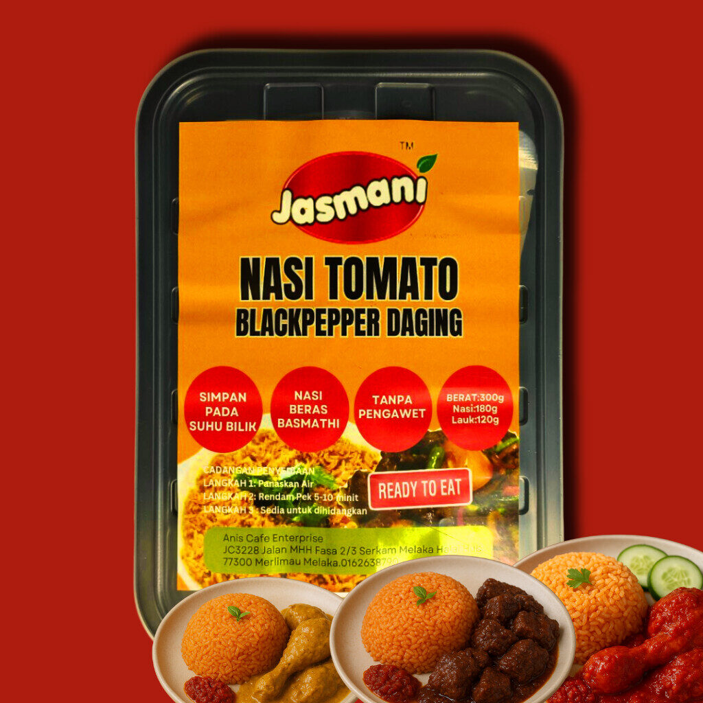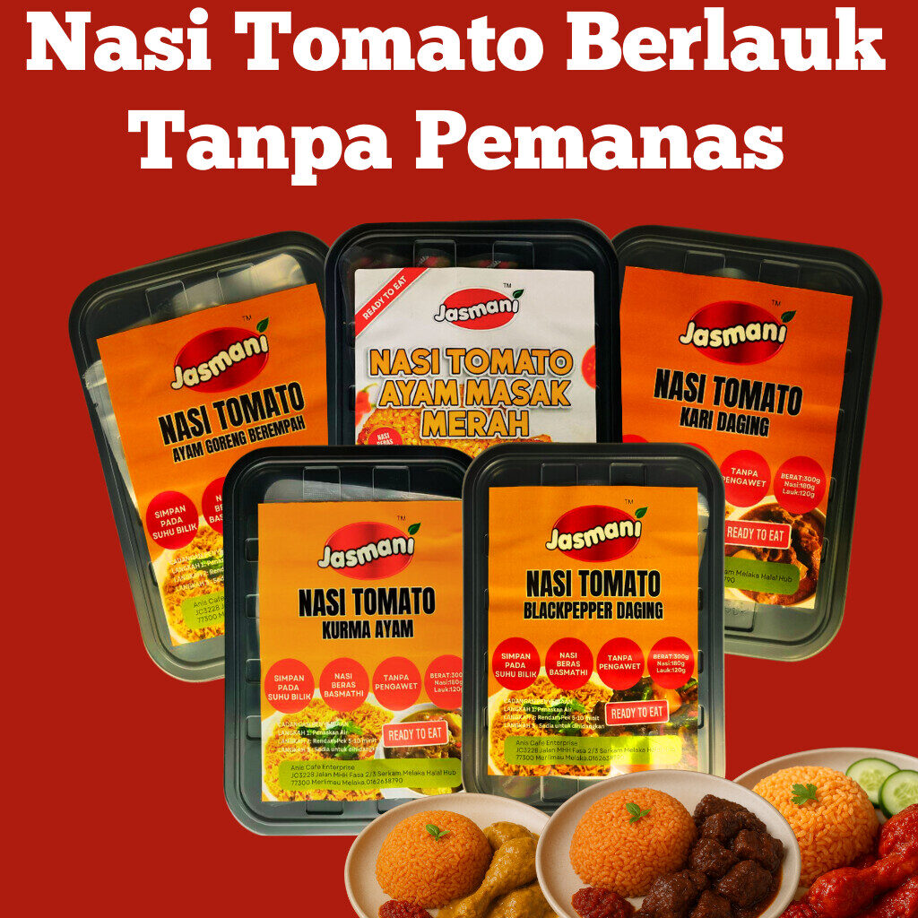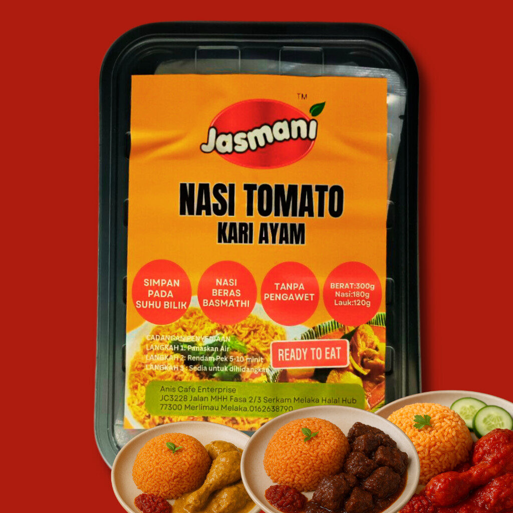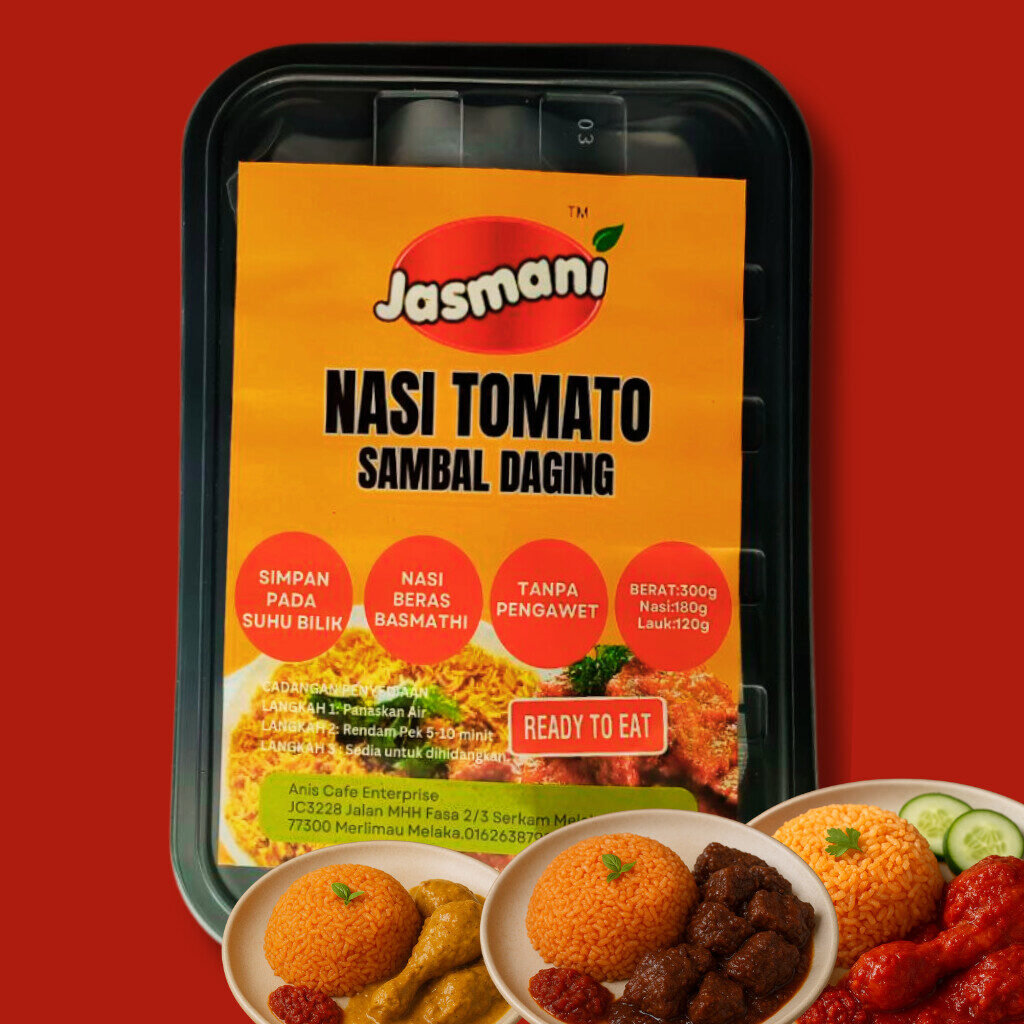 Nasi tomato yang harum, lembut & penuh rasa — dipadankan dengan pilihan lauk premium. Lengkap dengan pemanas, sesuai untuk travel, kerja, asrama & emergency meal.
